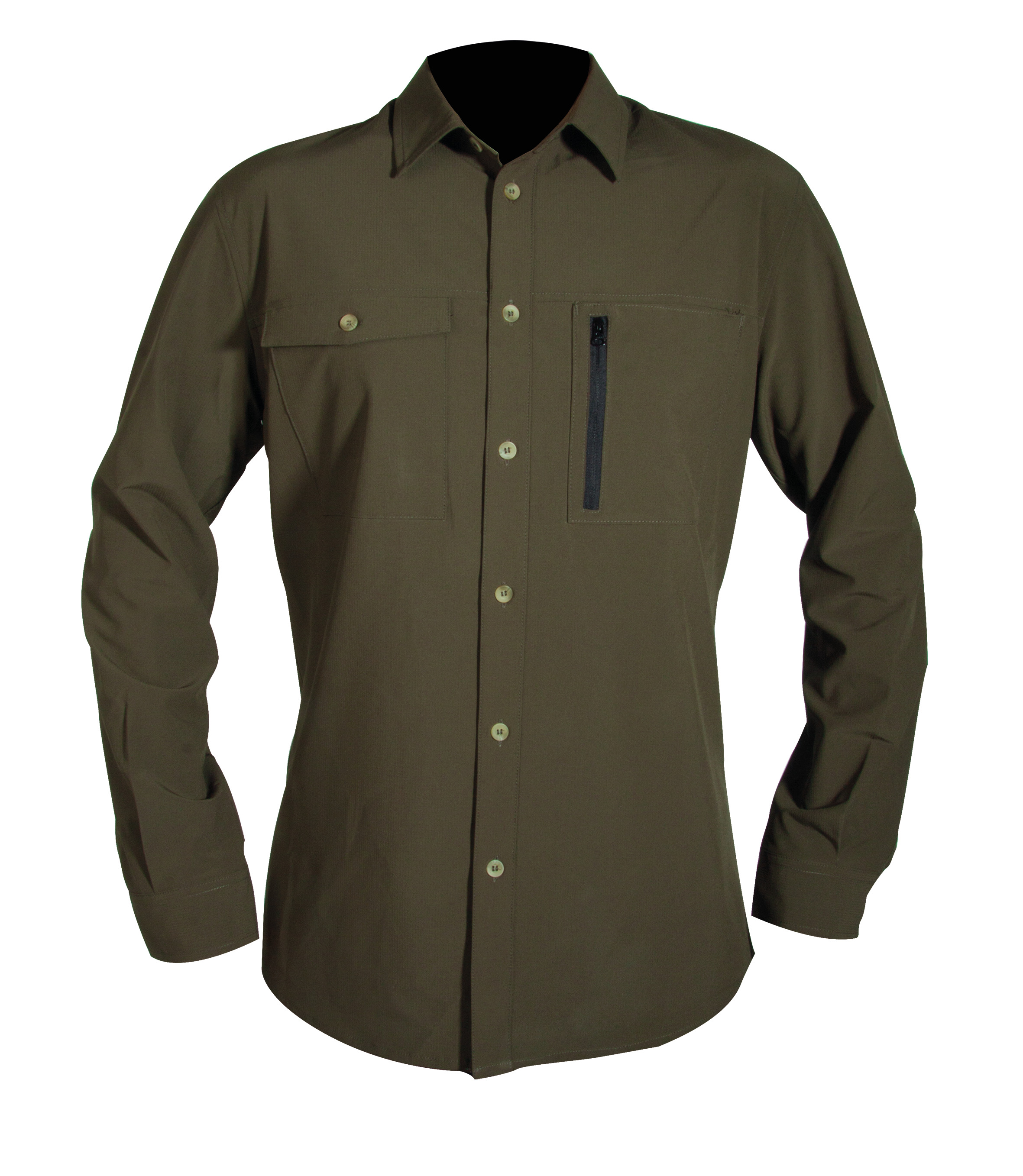 Tkanina Rip-Stop je ľahšia, hygienickejšia a odolnejšia. Okrem toho má košeľa vetracie otvory - zadný prieduch so sieťovinou, golier a dve náprsné vrecká: jedno s gombíkom a druhé so zipsom.