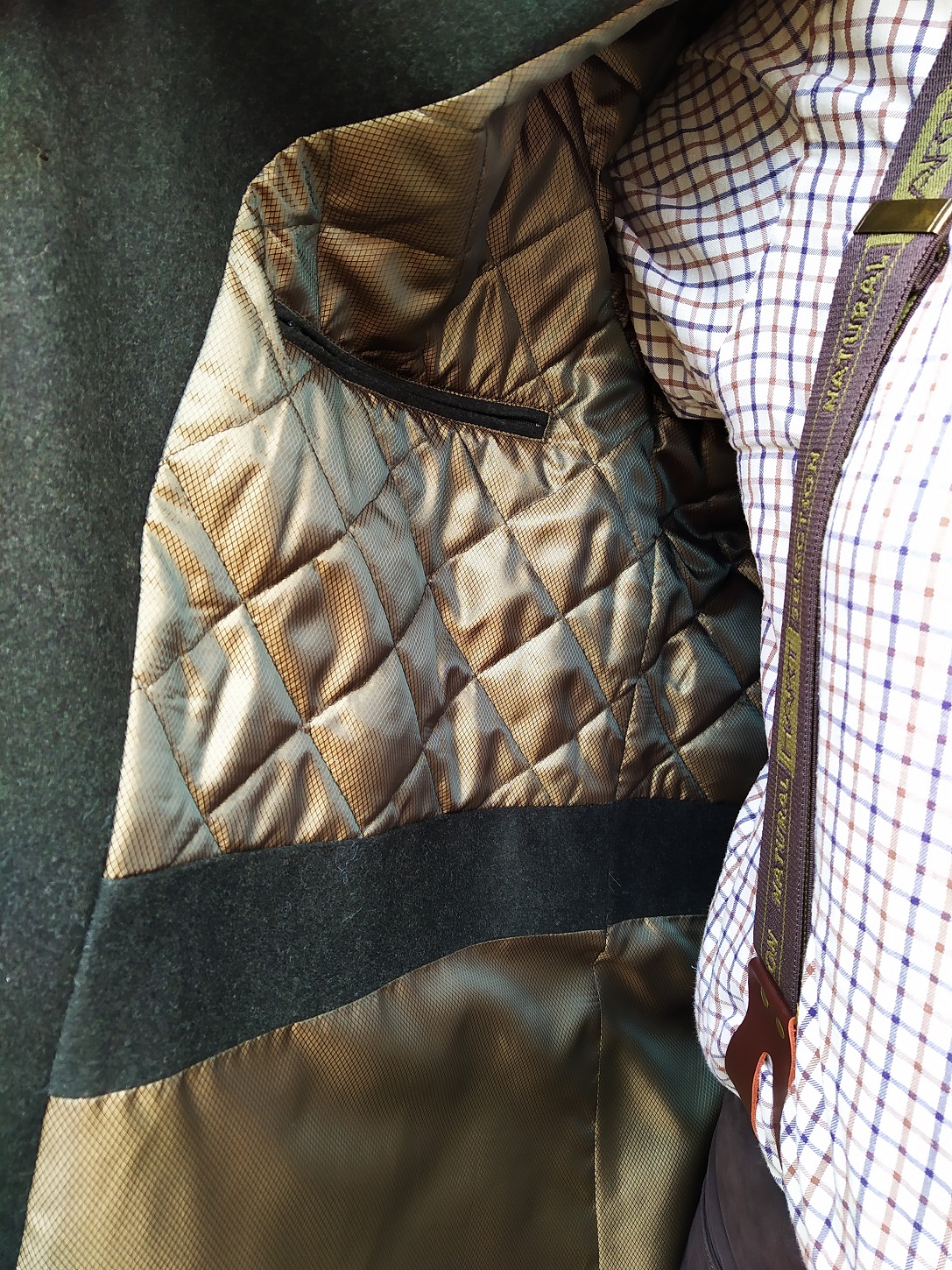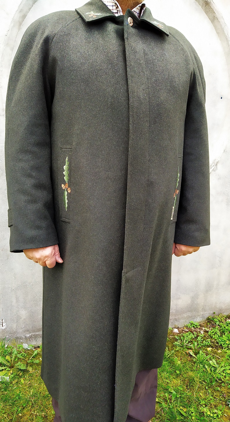 Dlhý pánsky kabát Levente II. reglánového strihu, má skryté zapínanie, chrbát s protizáhybom a golier s výšivkou, alebo parožím.