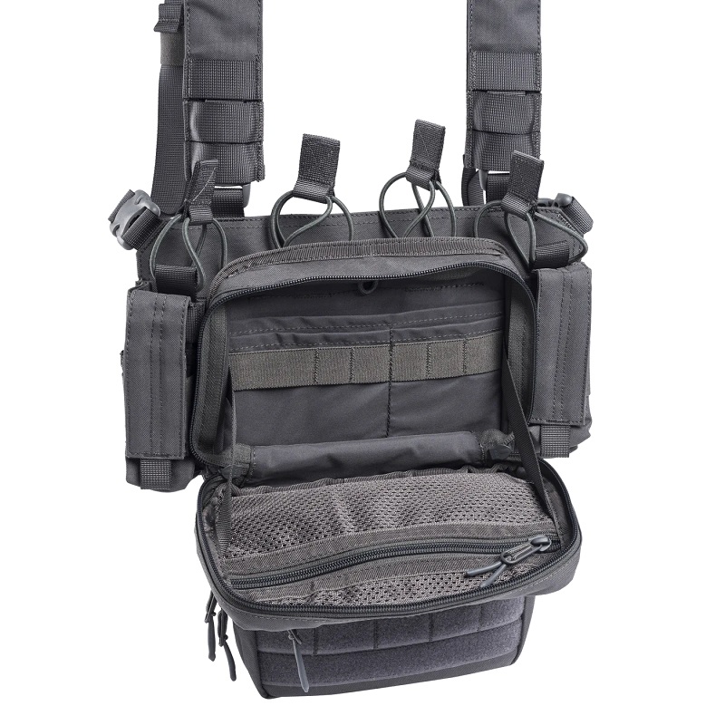 Tactical Chest Rig vyrobený z vysoko odolného ripstop materiálu. Do hrudnej súpravy sa zmestia až 4 zásobníky STANAG a 2 zásobníky pištole. Rozhranie MOLLE umožňuje používateľom prispôsobiť podľa svojich potrieb. Veľké viacúčelové vrecko umiestnené na prednej strane a odnímateľné vrecko na spodnej strane. Hrudník je vybavený dvoma nastaviteľnými upevňovacími popruhmi rôznych dĺžok, aby sa zabezpečilo optimálne uchytenie.