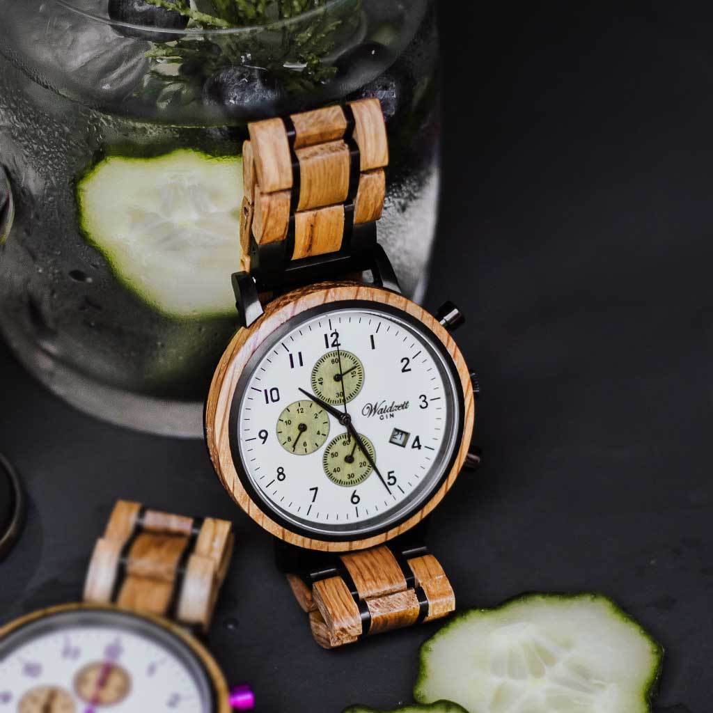 Drevené hodinky chronograf „Gin Cucumber“ majú výrazné zelené prvky na číselníku. Gin hodinky od Waidzeit by mali zdôrazniť čas na niečo zvláštne a zdôrazniť hodnotu pre remeselnosť