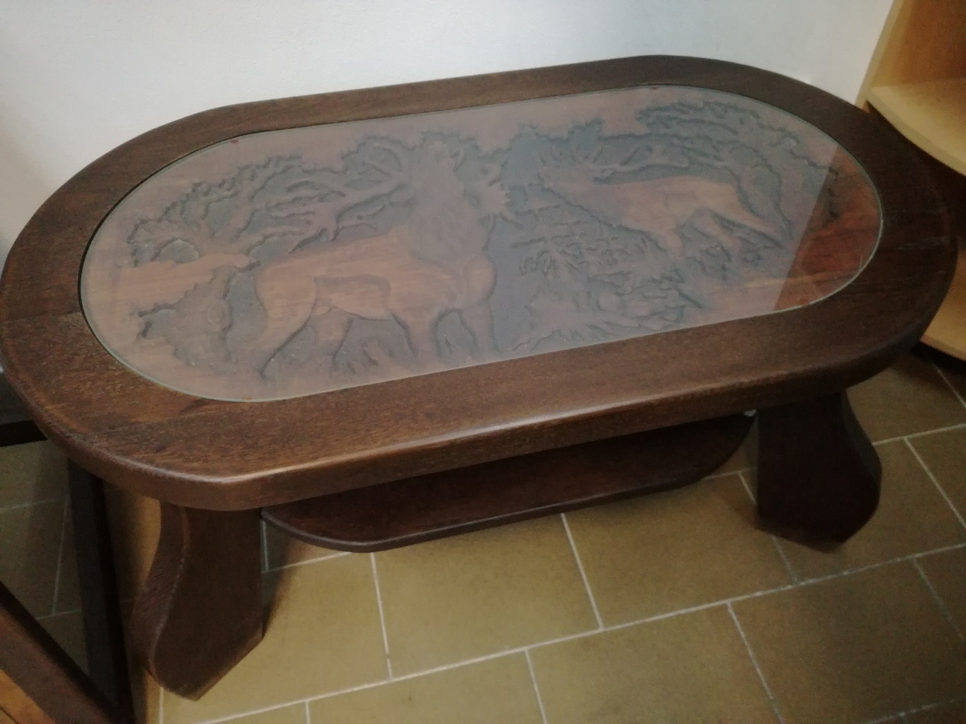Ručne vyrezávaný drevený stôl s poľovníckym motívom.