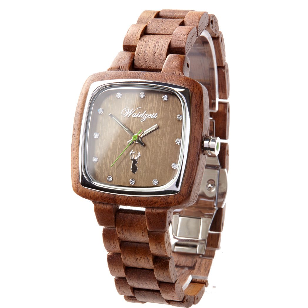 Hodinky sú vyrobené z orechového dreva a kvalitnej nehrdzavejúcej ocele. Podklad ciferníka tvorí orechové drevo. Strieborné ručičky hodiniek, krištáli na mieste čísiel a logo jeleňa dodáva hodinkám potrebnú vážnosť a eleganciu.