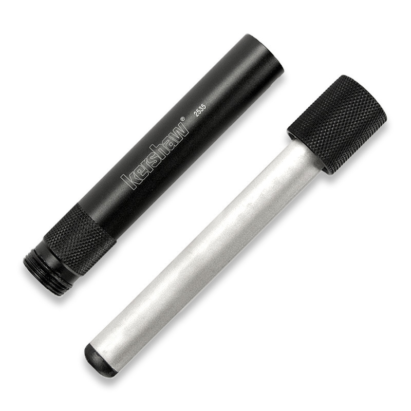 Diamantová brúska Kershaw Ultra-Tek 2535s rukoväťou z hladkého čierneho eloxovaného hliníka s ryhovanými časťami pre pevný úchop, v jej vnútri je oválny hriadeľ so zrnitosťou 600 mm a diamantom. Hriadeľ sa dá jednoducho odskrutkovať a vložiť ho na druhý koniec.