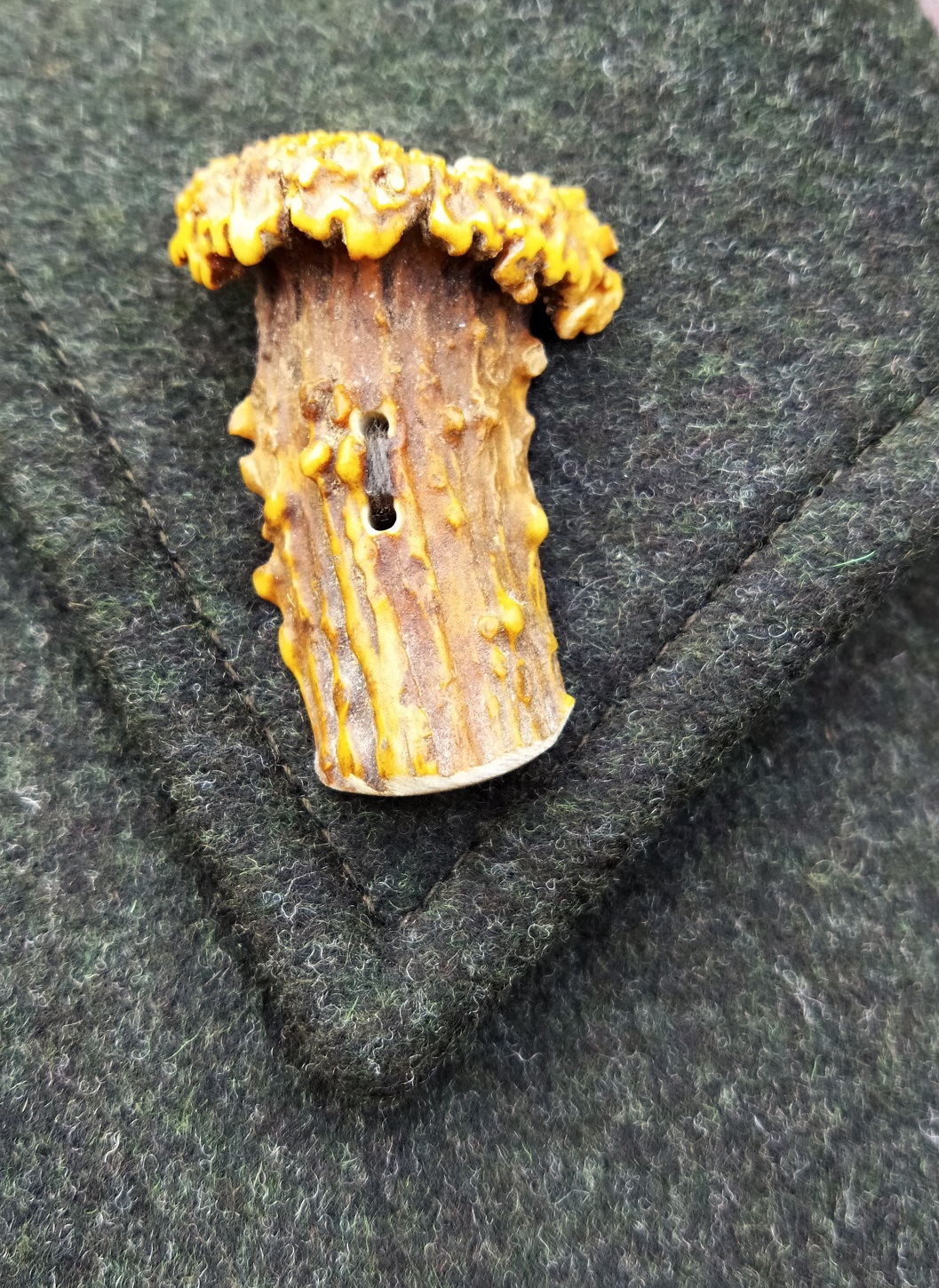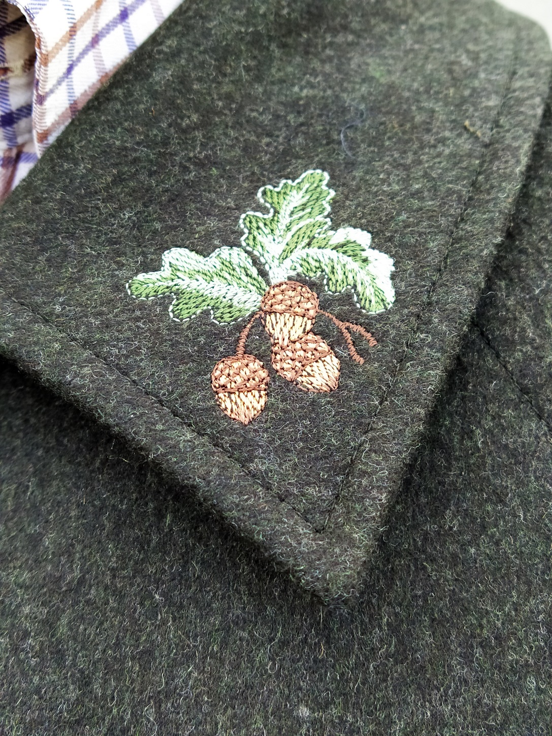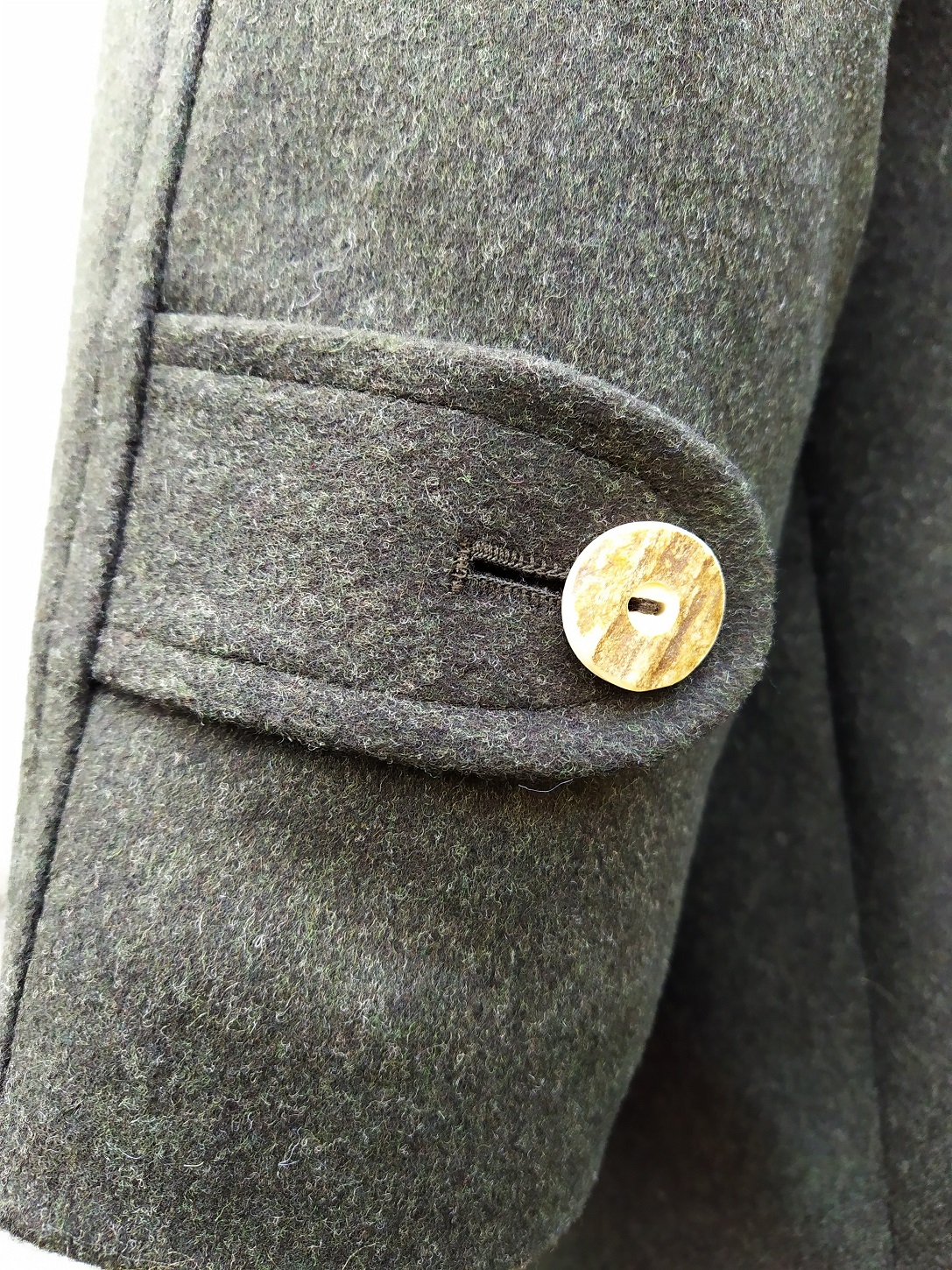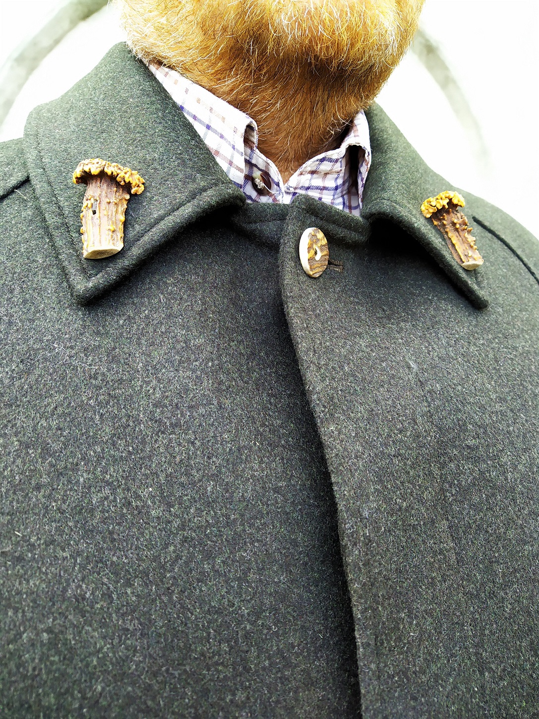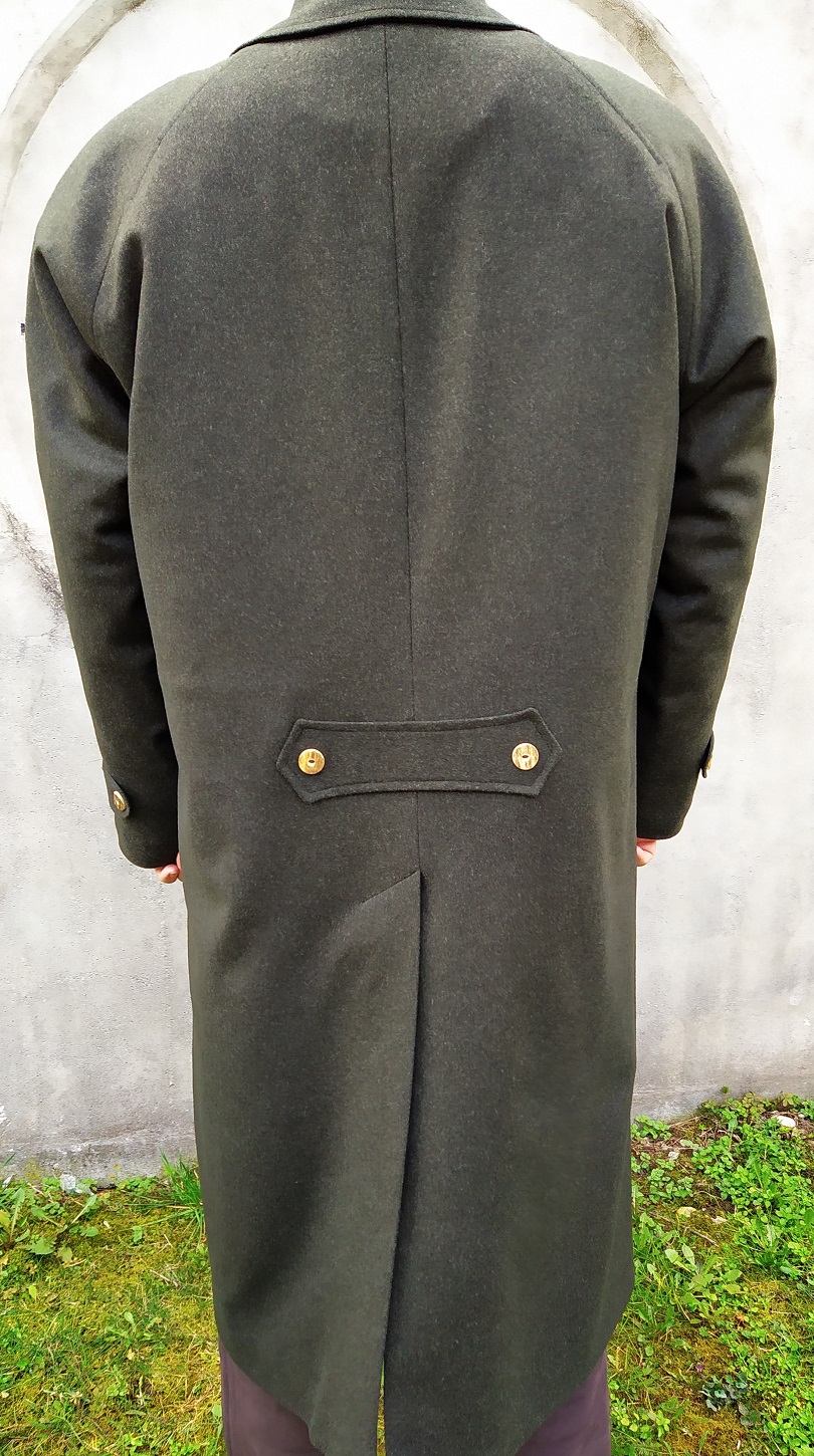 Dlhý pánsky kabát Levente II. reglánového strihu, má skryté zapínanie, chrbát s protizáhybom a golier s výšivkou, alebo parožím.